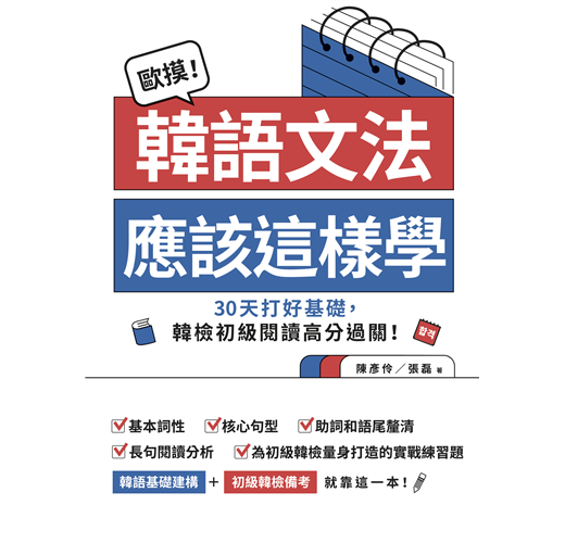 大量實用例句和練習題,讓你立刻獲取最實用的句子及使用方法;全書練習題以「初級韓檢題型」為主軸設計,文法基礎觀念學習與初級韓檢閱讀備考同時高效進行,實力、分數一次擁有。