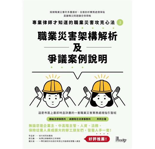 為了處理上述困境,本叢書將職災爭議分門別類,並於各類的爭議下,羅列實務上常會遇到的職災問題,再以問與答之方式,整理了對應的法規以及實務見解。本叢書共計三冊: