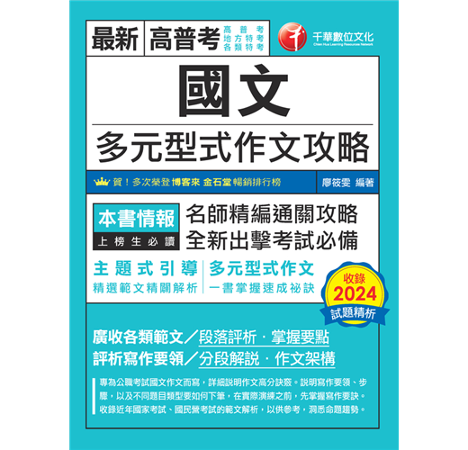 第1章~第5章為基礎教學,先從閱讀、表達、審題等面向說起。有了正確的寫作觀念,即便是面對多元型式作文,也可以迅速在腦中找到素材,並組織出一篇文章的藍圖。第6章~第10章為進階訓練,以實際的國考題目作為範例,每一則範例均含「思考指引」、「架構與內容」、「精選範題」等內容,藉此逐一解說各種題型的應對方式,以及如何構成一篇文章。