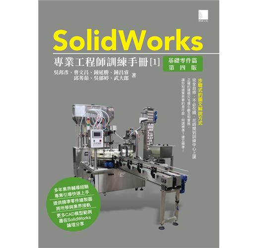 這是一本專門介紹SolidWorks零件的培訓應用書籍,強調基礎教育,內容與時俱進使用最新版軟體,也是設計給初學者進行基本訓練到一流工程師的養成系列計畫之首部曲,一次擁有草圖和特徵兩大製圖靈魂。本書可與《SolidWorks專業工程師訓練手冊[2]-進階零件與模組設計》連結,會讓你迫不急待想進階學習,這本基礎篇保證自發性重複閱讀,並為模組化的基礎紮根,且每次閱讀都有不同意境。
