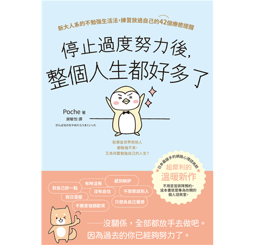 本書的存在就像是一間專為患有「過度努力症」讀者而開的犀利診療室,以42個「人生不用那麼努力也沒關係」的療癒提醒為處方簽,解答所有關於「不自覺為別人努力」的疑難雜症。時而溫柔,時而直白,搭配超萌小動物,用最淺顯易懂的話語開導你、陪伴你一一解開那些長年加諸在自己身上的「過度努力」束縛。