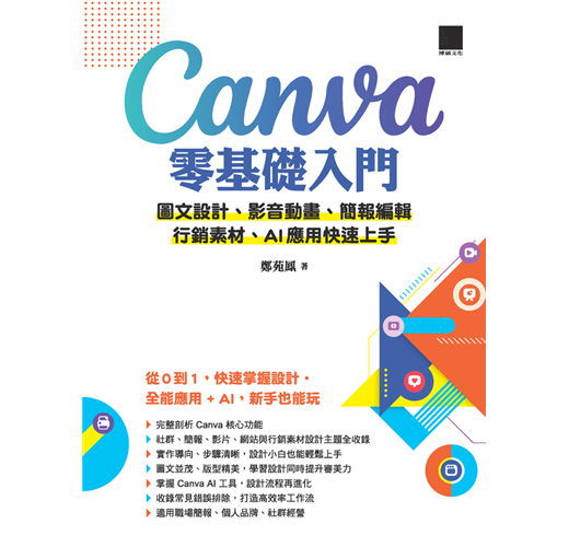 不論你是初學者、職場工作者、自媒體經營者,還是教育、創業或行銷領域的設計需求者,本書都可引領你掌握Canva的無限可能,讓你從設計門外漢,成為創意高手!