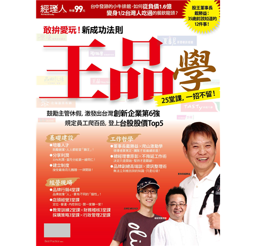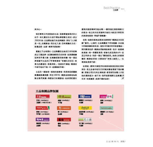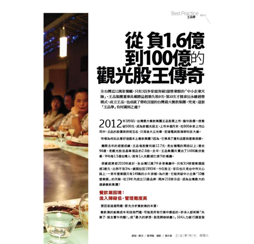 兩個月內,我們專訪了14位高階主管、吃遍8個品牌,旁聽各重要會議。主管們也大方提供各式工作表單、財務數字、甚至創業計畫書,不怕被「偷學」。2008年9月,《經理人月刊》以40頁篇幅刊出「複製成功模式的Know-How」企業案例,成為第一個深入解讀台灣餐飲龍頭的財經雜誌。