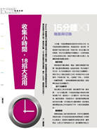 所以,雖然在李欣岳、盧昱瑩的報導中,有很多聰明利用零碎時間的故事,但我們真正想說的是,這並不是請大家把一天安排到「乾毛巾也能擰出水」,而是掌握這些片刻後,不管做的是你喜歡的、還是不喜歡的事,日積月累後都會有其深刻的意義,而且,你真的會驚訝於它所展現的力量(第108頁起)。