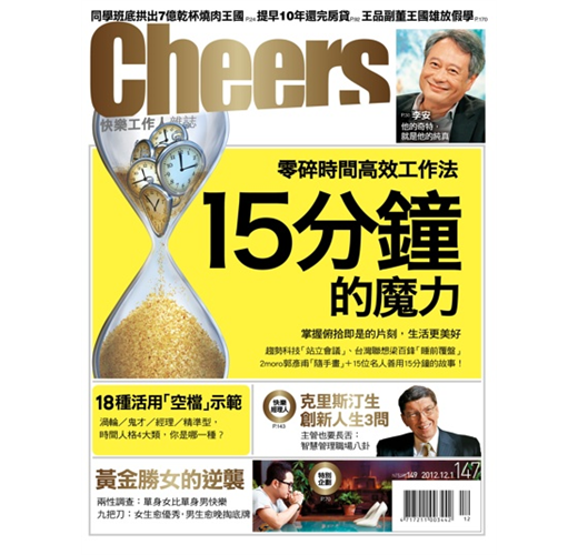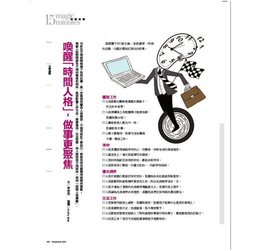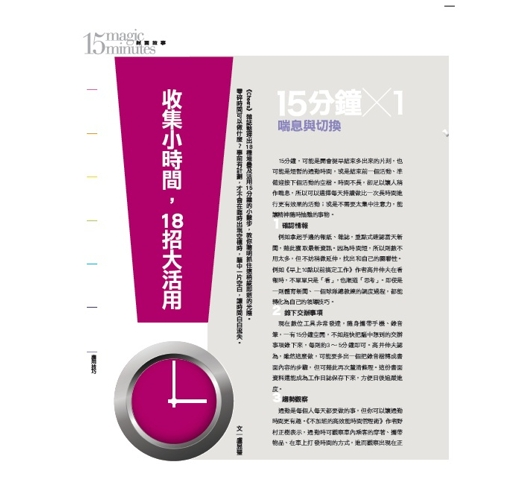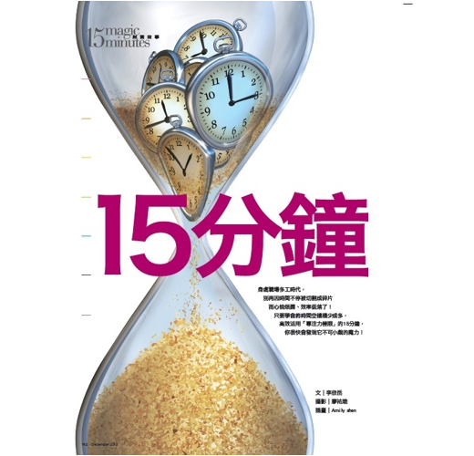 當主編李欣岳提出「15分鐘的魔力」這個題目時,大家第一個反應就是「莫非要講時間管理?」也是,也不是。我很同意李欣岳的觀點,與其說它是個時間管理的題目,倒不如說是個自我修練的題目。每天,都有無數個突然冒出來的 「5分鐘」、「10分鐘」,稍不留神就從指縫中溜走。如果能有意識地抓住這些時間碎片,做些什麼,當這「什麼」是讓自己開心的事時,快樂就無所不在了;當這 「什麼」是本來會頭痛的事時,就像培養抵抗力,總有一天你會發現,有一天頭不再痛了,這件事自然而然就可以完成了。