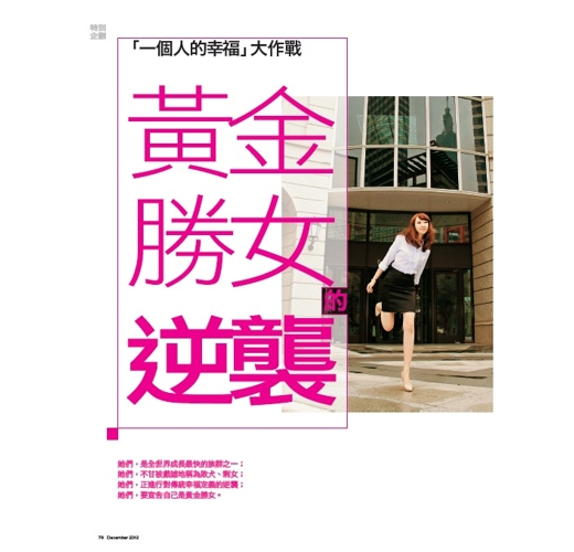 這期雜誌中好看的文章不少,例如副總編輯洪懿妍、陳怡伶製作的「黃金勝女的逆襲」特別企劃(第70頁起)。從「女強人」一路演變到「女力」,我想今天的女性要全力逆襲的,未必是從男性手中贏得更多的資源和權力,反而是真正打破那些仍在潛意識中埋藏的觀念包袱。作家九把刀也在當中分享了他的觀點,相信不管男性或女性讀者,這系列報導都值得一讀。
