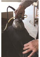 別小看這熨斗跟熨馬,雖然現在熨馬通常都與燙衣板結合,不過在早期熨馬對於燙西裝褲的功用可是很大呢。阿明師打開熨斗開關,接著將上頭的水源打開,透過電熱冒出的水蒸氣,溫度頗高。他隨手取過一件西裝褲,將熨馬放在褲子臀部的位置,微微弧度的熨馬與臀部的褲型貼合得很好,原來熨馬是專門設計給在有弧度的衣褲使用。