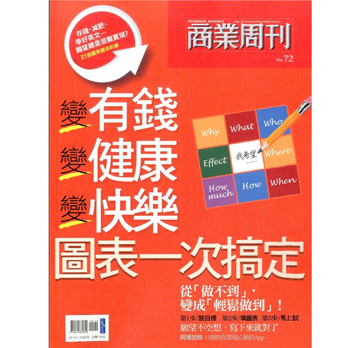 人生中的願望,大至買屋投資、創業跳槽,小到出國旅行、減肥,都可以透過具有「路徑圖」概念的計畫表單,有效率的規畫、執行。本刊將針對多數人最常許願的願望:學好語文、找更好工作、開店當老闆、多存點錢、買房子、減重、多陪伴家人、到新地方旅行,分別為讀者提供量身訂做的2~3張圖表,Step by Step協助讀者分析評估自己、找到執行方法、記錄執行過程,逐步圓夢!