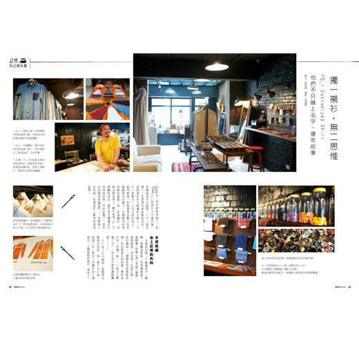 特別企劃「訂做自己的衣服」,就算缺乏巧手慧心,訂作一件客製衣,只要四個步驟:挑布,棉麻絲綢雪紡紗;丈量,誠實面對身材曲線;打版,精準裁切衣料拼圖;縫製,穿梭引線埋針收齊。送你,名為獨一無二的手藝。