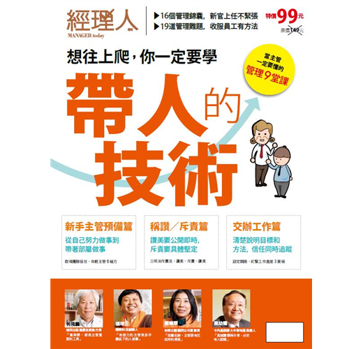 本期特刊就是為了想往上爬,想當主管和正在當主管的你所設計的主管必修課,教你從認知自己是主管開始,一步步學著找出部屬的優點、傾聽部屬的心聲、保護他們、讚美、斥責他們,到授權給他們,放手讓底下的人做事,當部屬都能順利完成工作,你就能去分擔你的老闆的工作,接下更大的責任。