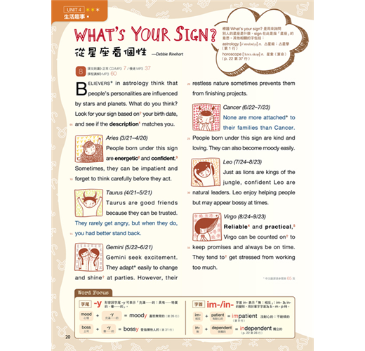 單字學習方面循序漸進,參考大考中心頒佈的「高中英文參考詞彙表」,每月依字級列出一般字彙、參考字彙、小辭典,生活、考試都實用。文法Language Notes採用圖解,清楚明白好吸收,每天還附有小測驗,可以馬上測試學到的成果喔!