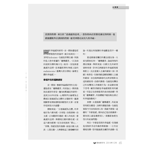 在一開始,整個幸福感研究的主流,還是都在「趨樂避苦」的討論上,將焦點放在感官的享受,趨向短暫滿足的研究。直到2000年前後,心理學界以倫理為主體或以意義感為主體的主題研究,邀請相關學者專家撰寫回顧性的文章,在當時受到很大的迴響。