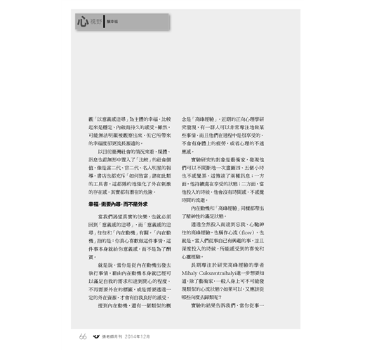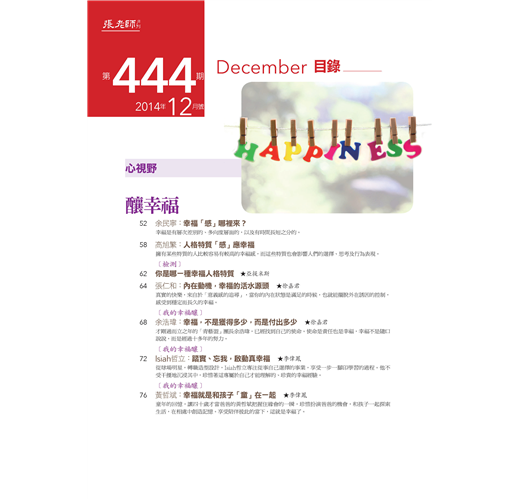 這本雜誌,有豐富的社會心理探討、趣味的自我心理探索、最新的心理資訊和學者專家的解析。我們談快樂和成功,也談挫折和憂傷。我們喜歡光明面,但也試圖去理解幽微和黑暗。我們傾聽理性和堅強的故事,也願意探索感情的衝動和脆弱。