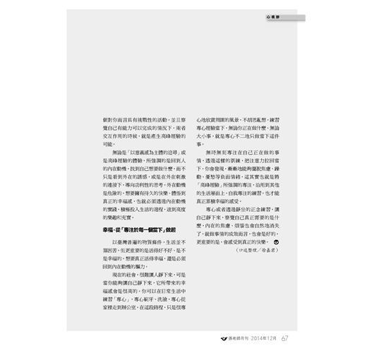 無時無刻專注在自己正在做的事情,透過這樣的訓練,把注意力拉回當下,你會發現,漸漸地能夠擺脫焦慮、躁動、憂愁等負面情緒,這其實也就是將「高峰經驗」所強調的專注,沿用到其他的生活層面上。自我專注的練習,也才能真正累積幸福的感受。