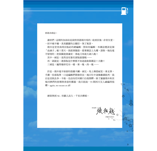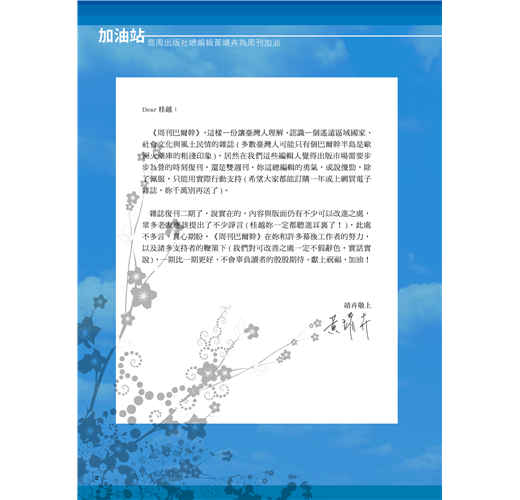 讀者們,這期的加油站是我特別請靖卉寫的,收到信後,非常失望,一封不痛不癢、美美麗麗的公關信,煞了風景。