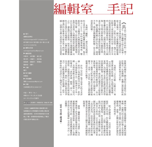 創設於2011年,是一本以媒體/文化批判為主的獨立評論雜誌,關懷在地公共議題及文化活動,提供深度分析社會脈動的評論及報導,希望提供讀者不同於主流的觀點。