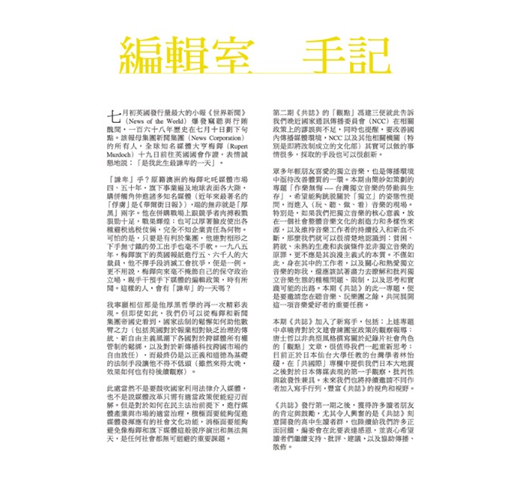 創設於2011年,是一本以媒體/文化批判為主的獨立評論雜誌,關懷在地公共議題及文化活動,提供深度分析社會脈動的評論及報導,希望提供讀者不同於主流的觀點。