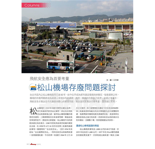 國內日前發生了復興航空GE235班機墜落於台北市區內的飛安事故,造成機上超過30人罹難的慘劇,讓松山機場的存廢問題再次浮上檯面。在這次的意外中,台北市區內的車輛與高架橋受到失事班機的波及;試想,若班墜落於都市中心,後果又是如何?Airway的專欄作家─江天錚也特別在212期針對松山機場的潛在飛安風險,以及其遷移與廢除的策略作深入、精彩的探討,Airway在此拋磚引玉,歡迎各位航迷讀者搶先閱讀本期的《江天錚專欄》,並歡迎讀者們轉貼給更多的朋友閱讀。