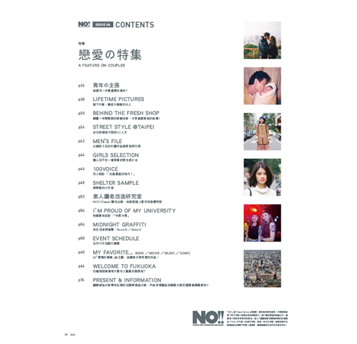 NO!! Magazine,不只是流行刊物,更是文化刊物,以免費誌形式傳達出台灣時下年輕人最真實的生活方式及食衣住行。