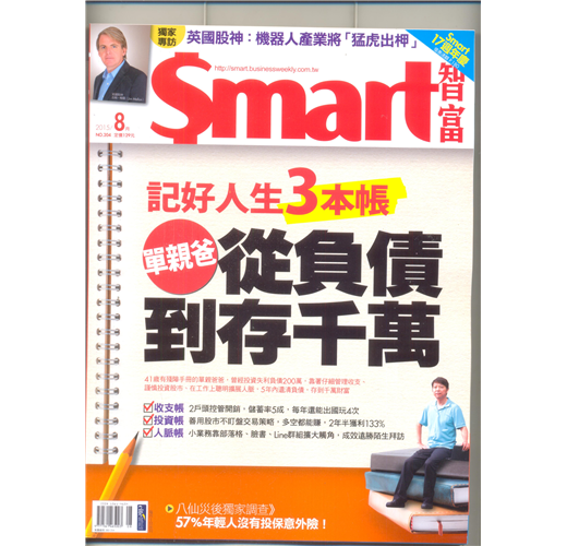 8月份《Smart智富》月刊的主角是一位單親爸爸,他曾經因為錯誤的投資方法把資產賠光,甚至負債200萬元,他最後是怎麼在5年內重新贏回他的千萬元呢?無非靠的就是理好人生3本帳——「收支帳、投資帳,以及人脈帳」!搶先讀》記好人生3本帳 負債單親爸存千萬http://goo.gl/qpkGQ6