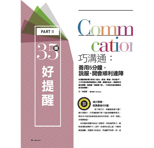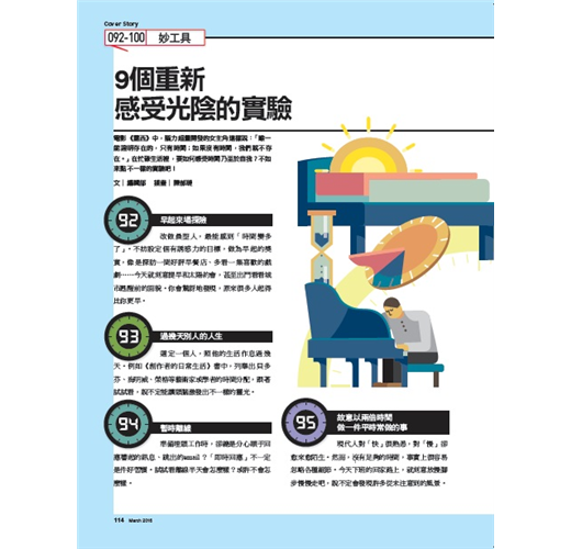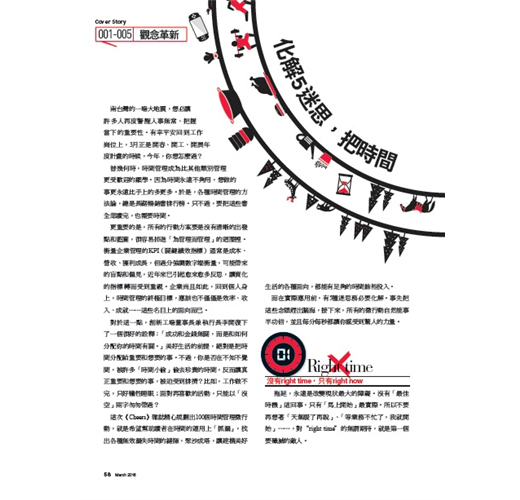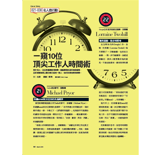 在開春之際,我們特別企劃了「100個時間管理微行動」,就是企圖幫讀者們揪出在不知不覺中蠶食鯨吞你精力和時間的殺手(見第56頁起)。只需要一點小技巧和有意識地實踐,不只是職場生活中,開會不用再花這麼多時間了、溝通不用再花這麼多時間了、做筆記不用再花這麼多時間了;甚至下班後,想要煮飯給家人、減掉身上的肥肉、整理四周的雜物,都不用再花這麼多時間了,於是,原來沒辦法做的事、難以投入的夢想,也就自然而然可以排進行事曆中。