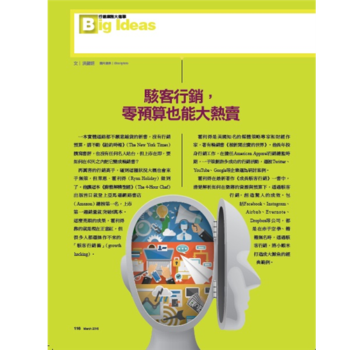 創造新的人生之餘,別忘了仍要掌握新知,搭上趨勢浪潮。有幾個關鍵字,絕對會繼續撼動2016年,一是FinTech(金融科技),一是數位科技發展下帶動的成長駭客行銷(Growth Hacker Marketing)。這兩大趨勢帶給工作人哪些衝擊和應用,雜誌中也有深入報導,推薦讀者一讀(見第14~17頁、第116~120頁)。