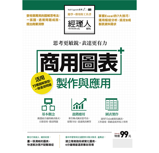 在你的工作中,可能經常需要將數據、資料轉換成圖表,幫助你掌握業績成果,或者與其他人溝通,問題是,你通常要花多久時間,才能把資料變成讓人一眼就看出重點的圖表? 有時候,你得從龐大的資料中挑出相關數字,經過繁瑣的比較與整理,畫出能幫助你決策的圖表,萬一事後發現某個運算環節出錯,所有流程可能都要重來一次。 還有些時候,你為了展現專業度,每個概念都用好幾張圖表來說明,但是簡報時間有限,你只能像播放跑馬燈那樣展示完所有圖表,至於聽眾有沒有從中獲得啟發,你可能無暇顧及。 其實,圖表運用涉及3種面向的能力,最基本的是「技術」層次,也就是盡可能縮短製圖的時間,讓你能將大部分心力用在真正有價值的分析工作,而不是耗費在修改與調整圖表。 除了技術之外,更進階的能力是「表達」,包括知道應該挑選哪種圖像,才能將自己想表達的重點正確地呈現出來,甚至可以用一張理路清晰的圖,讓其他人也能輕鬆掌握事件全貌或是問題根源,提升管理效率。 如果把圖解表達的能力練到純熟,還可以提升你的「思考」能力,也就是在面對問題的階段,就能運用圖像化思考綜覽全局、拆解問題、精準分析,幫助你把事情想得通透。 以「圖」理「解」事物不只是一項天賦能力,也是一種技巧,可以透過後天學習而有效掌握。對於現在的職場工作者來說,用圖表傳達概念已經是基本能力,因此,無論你在哪個領域、哪種職位,如果想從人才群中脫穎而出,都可以勤加練習圖表運用的技巧,不斷提升思考、溝通與管理的效率,也讓你的專業形象持續升級。