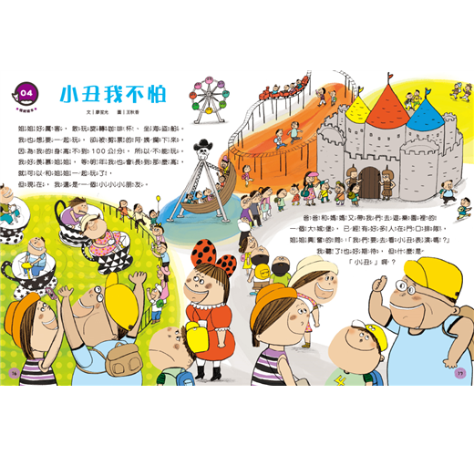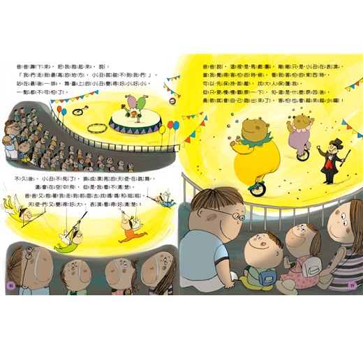 弟弟第一次在遊樂園中看到小丑表演,小丑有一雙鴨子的腳、大象的屁股、亂七八糟的頭髮、講話聲音像公雞一樣,還有一張好大好大的「嘴巴」。弟弟害怕得心蹦蹦跳,緊張到快不能呼吸了!看爸爸怎麼幫助弟弟克服恐懼,讓勇敢自己跑出來。