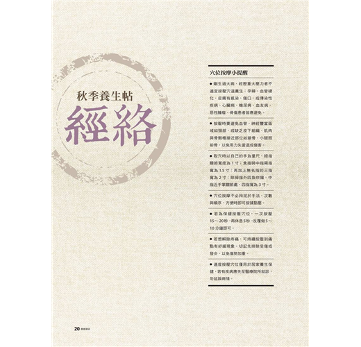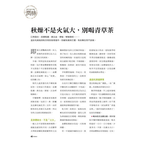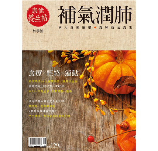 不同於春天的雨水與夏天的濕氣,台灣的初秋風大加上濕度降低,天氣偏燥熱。中醫認為秋氣主燥,肺燥氣虛,容易耗氣傷陰,因此,《康健養生帖》秋季號以「潤肺、養肺」為主軸,以「養、收」為養生原則,一貫從調養體質、經絡穴位、飲食、運動著手,預防秋燥的不適,儲存可安度冬天的...