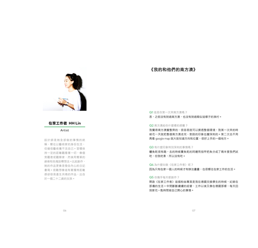 這次邀請到名為在家工作者的插畫家 HH Lin 來南方澳玩,HH Lin 不太像是一個觀光客,從她的作品中總是能感受到她的觀察,觀察著這個漁村、觀察著觀光客、帶著想像的觀察著。HH Lin 把這些觀察用簡單的線條和色塊創作了一系列的作品成了這期的展覽《我的和他們的南方澳》。她的創作靈感除了親眼所見的場景外,還來自從文字和其他影像對南方澳的描述與理解。隨著 HH Lin 的觀察,我們也在一條南方澳的大街上展開我們的觀察,看著這裡隨時間變化著的景象。