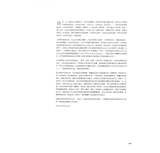 Let's Talk about WHITE 036 米的精進與極致|顧瑋:美是纖細的,但永遠值得 040 廚事裡的白色生活道具|許凱倫:白色是我的療癒系 044 談穿搭|ADC Karen & Marco:白色是一種溫暖又自信的顏色 048 原研哉著作《白》|白不是顏色,而是一種感受性