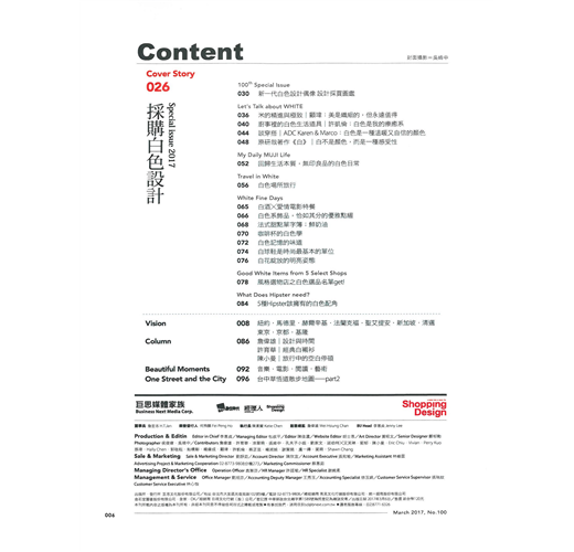 白色是不變的經典顏色,簡潔的白色設計席捲了日常生活。從食、衣、住、行談談白色設計所帶來的好感,也談談白色設計帶來的新風潮。第100期的特別企劃,巧妙的與創刊號白色設計相互呼應、精彩回顧。