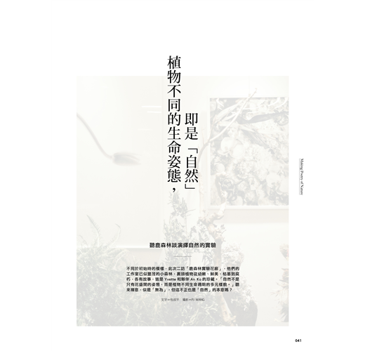 造訪植物創作者L&F浩哲的靈感之山 珍奇植物藏家Marc的綠色告白 鹿森林實驗花廊的自然哲學 肯園溫佑君談氣味療癒觀 香草入菜的自然之味食單 逗留在有植物相伴的場所 世界的自然系保養推薦