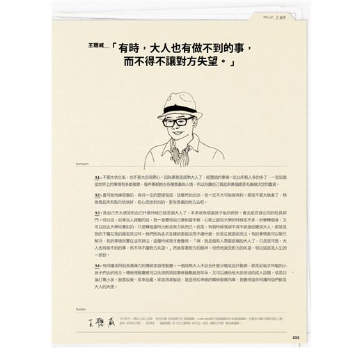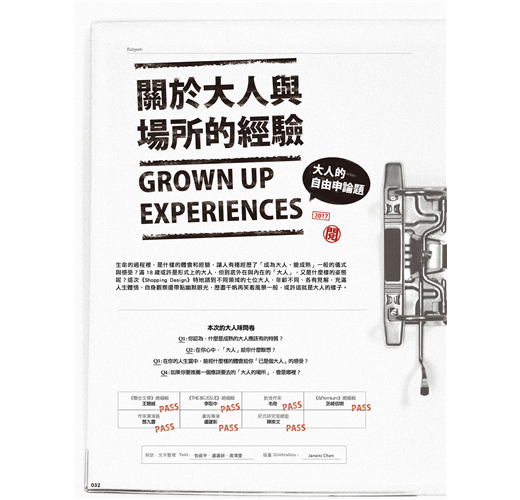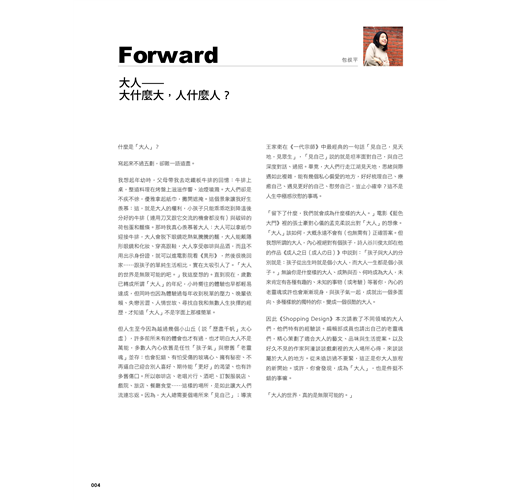 「留下了什麼,我們就會成為什麼樣的大人。」電影《藍色大門》裡的張士豪對心儀的孟克柔說出對「大人」的想像。「大人」該如何,大概永遠不會有(也無需有)正確答案。但我想所謂的大人,內心裡絕對有個孩子,詩人谷川俊太郎在他的作品《成人之日(成人の日)》中說到:「孩子與大人的分別就是:孩子從出生時就是個小大人,而大人一生都是個小孩子。」無論你是什麼樣的大人、成熟與否、何時成為大人,未來肯定有各種有趣的、未知的事物(或考驗)等著你,內心的老靈魂或許也會漸漸現身,與孩子氣一起,成就出一個多面向、多種樣貌的獨特的你,變成一個很酷的大人。 因此《Shopping Design》本次請教了不同領域的大人們,他們特有的經驗談。編輯部成員也請出自己的老靈魂們,精心策劃了適合大人的藝文、品味與生活提案。以及好久不見的作家阿潼談談戲劇裡的大人場所心得,來談談屬於大人的地方。從未造訪過不要緊,這正是你大人旅程的新開始。或許,你會發現,成為「大人」,也是件挺不錯的事嘛。