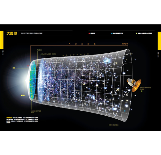 第三層是「宇宙」,也就是星系中大量物質的集合,其中大多是一種稱為暗能量的未知形式。