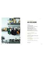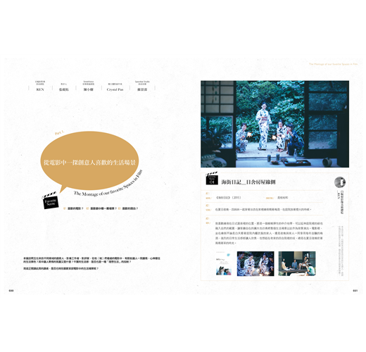 The Montage of our Favorite Spaces in Film 030 從電影中一探創意人喜歡的生活場景| 獨立攝影創作者Crystal.白輻射影像美術總監Ren.影評人張硯拓 StreetVoice音樂頻道總監陳小樹.Spacebar Studio美術指導蘇景霈 Living in Fascinating Places 040 體會活在「自然」的姿態|光與氣味研究者Taffi的療癒客廳 044 撫慰人心的好友聚會所|MyPlace私處的靈魂廚房 050 與老物件相互證明的存在|畫家王傑的古感書房 054 對舒適的想像是生活原點|策展工作者Kobe與Janet的居家展演 060 絢爛都會中的...