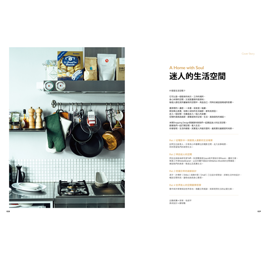 The Montage of our Favorite Spaces in Film 030 從電影中一探創意人喜歡的生活場景| 獨立攝影創作者Crystal.白輻射影像美術總監Ren.影評人張硯拓 StreetVoice音樂頻道總監陳小樹.Spacebar Studio美術指導蘇景霈 Living in Fascinating Places 040 體會活在「自然」的姿態|光與氣味研究者Taffi的療癒客廳 044 撫慰人心的好友聚會所|MyPlace私處的靈魂廚房 050 與老物件相互證明的存在|畫家王傑的古感書房 054 對舒適的想像是生活原點|策展工作者Kobe與Janet的居家展演 060 絢爛都會中的一條透明河流|米蘭平面設計師Matteo Morelli的靈感公寓 Talking About Daily Storage 066 擺放的美學—— 生活裡的收納萬物論|馮宇XPHDC It's People who Make a House a Home 074 「人」,讓空間變成了「家」|世界旅人許育華的空間觀察哲學
