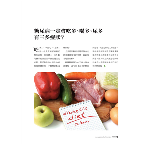>一般讀者:預防高血糖,從生活習慣揪出隱形糖尿病。你的罹病機率有多高?哪些飲食要避免?糖尿病前期如何逆轉?父母有糖尿病,我該注意嗎?