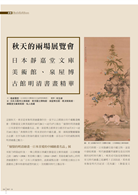 山水畫之外,本期與書畫相關的多元精彩內容,尚有「展覽」單元呈現了南京博物院盛大舉辦之在寫意花鳥畫史上具典範地位的明代徐渭、陳淳花鳥精品特展,以及深度導賞了日本靜嘉堂文庫美術館、泉屋博古館分別由「日本人憧憬」和「典雅與奇想」之企劃角度所聯合推出的明清書畫精華特展。「論壇」單元,詳盡報導了日前在常熟博物館所舉辦的王翬及虞山畫派學術研討會,具體而微地揭示當前研究新趨勢。「人物」單元,則專訪了上博書畫部主任凌利中,一探其如何從閱讀古文和編校圖錄的紮實訓練中,累積古代書畫鑑定與研究的專業能力,可供有心學習者參考。
