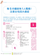 本期收錄四大婦癌與常見的婦科疾病,從原因、症狀到預防方法,讓妳知己知彼,百戰不殆。我們也邀請到陳保仁醫師與羅珮琳醫師兩大名醫,內容囊括內分泌系統、月經、生殖系統、婦科疾病與婦癌,乃至更年期保養,中西醫聯手教妳呵護自己的健康撇步,隨時注意身體發出的警訊,經血、疼痛、分泌物、臉色等都是可觀察對象,一旦察覺可疑異狀,及早檢查與治療,就能擊退女性健康殺手。