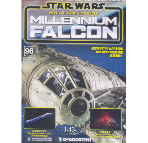 《STAR WARS千年鷹號太空船》週刊,2016年8月30創刊,全系列共100期,電影拍攝用模型1:1等比例完美呈現,燈光效果生動擬真,可拆式上蓋,讓船艙細節一覽無遺,還有活動自如的登船梯。每期介紹精彩的星際故事,附上質感細緻的組何零件,打造銀河系最酷炫的破銅爛鐵。