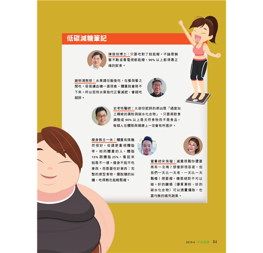 本期有8位專家提供他們寶貴的建議,其中有瘦身教主李一休,他如何瘦身有成還能保持5年好身材,以及長達20年不復胖的營養師宋侑璇。他們精采的故事與見解,應該可以幫助大家減少一點腰內肉。另外我們也特別討論了最近風風火火的生酮飲食,它真的適合你嗎?開動前請詳細閱讀本期內容,祝大家瘦得健康又美麗。