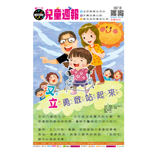 今年六歲的又立,一出生就沒有雙手和右腳,肺部塌陷和感染的危險,讓她在醫院住了好久好久。雖然,又立只有一隻腳,但她認為大家會的事情,她也一樣辦得到,活潑又愛笑的她說:「我的左腳可以做很多事!」