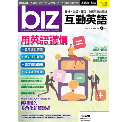 Biz互動英語雜誌是一本專為上班族及準備進入職場者所製作的職場英語學習雜誌,內容廣泛包含職場所需之英語訓練及商業知識,以輕鬆有趣的呈現方式,搭配精心編製的多媒體互動光碟,是職場英語進修及準備多益測驗的最佳讀物。