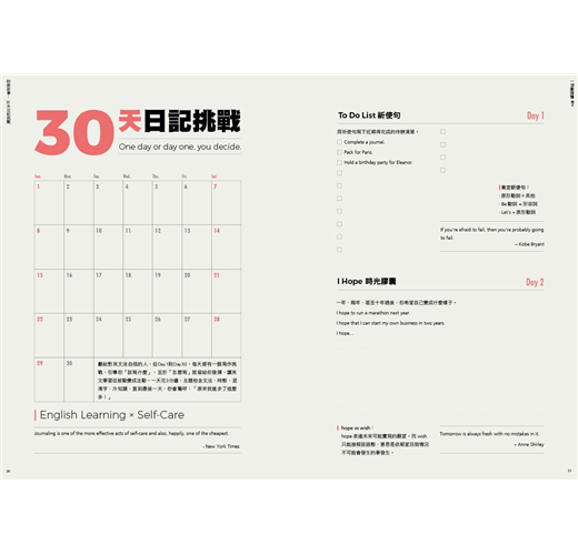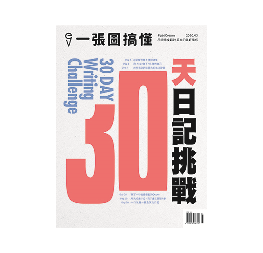 最後一刊的封面故事「30天英文日記挑戰」,是日記、也是遊戲,每天都有意想不到的關卡等著你破解,像是:Day 1用祈使句寫下待辦清單、Day 3用頻率副詞紀錄我的生活習慣、Day 16用進行式寫下我正在為目標努力些什麼、Day23用cost/spend/take寫出今天的消費......。