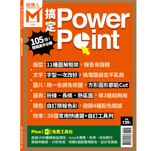 「為什麼他做的報告,老闆、客戶總是特別滿意?」每間公司裡或多或少有這種「神級簡報者」,不僅講話清晰、邏輯明確、幽默風趣,PowerPoint做得比別人專業,呈現的數據和資訊讓人一看就懂,難怪說什麼話都特別有分量,客戶和老闆馬上點頭答應。 這些高手為什麼比較厲害?差別可能是你努力錯了方向。比如一想到簡報就打開電腦,想到什麼就填上什麼,邊做邊改,既耗時又缺乏邏輯;也有人過度添加動畫和裝飾,沒想過這些設計如何增進簡報說服力,費心表演卻毫無共鳴;最常見的是將投影片視為文件,輸入大篇幅的段落,想讓聽眾一邊聽一邊讀,台下的人直接滑手機表達他們的疲倦。以上的錯誤,別再犯了! 近期紐約州長安德魯‧古莫(Andrew Cuomo)針對新冠病毒(COVID-19)所做的疫情簡報是極好的示範。比如,他以長條圖表現近一、兩個月每天新確診數,並將最新的長條以橘色凸顯出來,民眾不僅掌握最新近況,還能一併看清疫情走向是否趨緩。 想做出這樣的簡報,邏輯架構、美學概念、PowerPoint操作技巧缺一不可。這次我們從心法教起,帶你分析簡報的目的和聽眾特質,釐清說服決策者的簡報架構,才進入技法,把握留白、對比、字型、間距等設計原則,讓資訊好讀。另外,我們蒐集了最實用的PowerPoint操作教學,幫助你縮短製作投影片的時間,把精力花在「思考內容」,或者其他更重要的事情。 這些簡報高手都在用的技巧,如果從來沒有人教過你,就趁現在補齊,強健你的職場技能。下一次,靠一場簡報讓老闆驚艷你的實力!