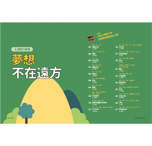 若你還沒找到興趣所在也不必擔心,透過閱讀百大學類及職人故事,你將能了解各領域學些什麼,踏入職場後又過著什麼樣的生活,
