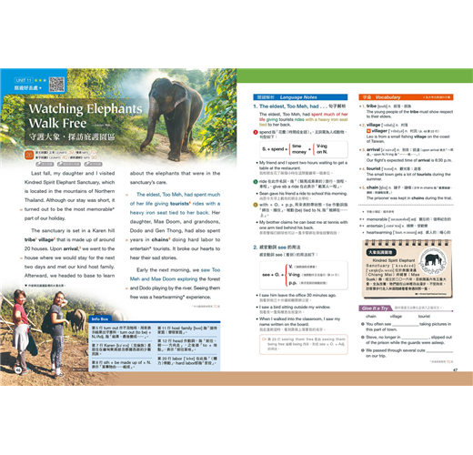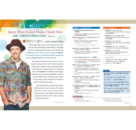 單字學習方面循序漸進,參考大考中心頒佈的「高中英文參考詞彙表」,每月依字級列出一般字彙、參考字彙、小辭典,生活、考試都實用。文法Language Notes採用圖解,清楚明白好吸收,每天還附有小測驗,可以馬上測試學到的成果喔!