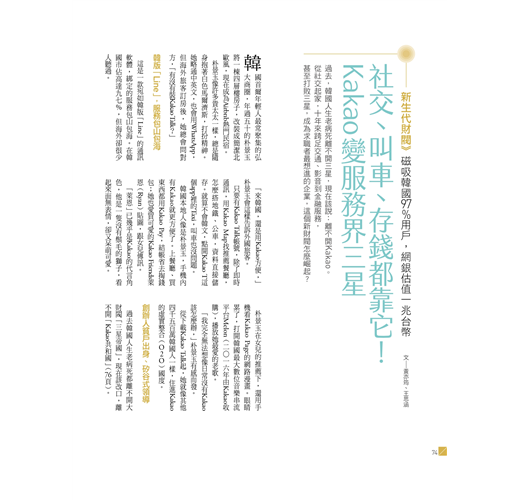 韓國前總統李明博的「生物相似藥產業」戰略,創造韓國二十億美元產值、五家具有全球競爭力的公司;前總統盧武鉉的「IT839戰略」也扶植了韓國數位經濟。本期《天下》完整報導兩家代表性公司賽特瑞恩(66頁)與Kakao。(74頁)