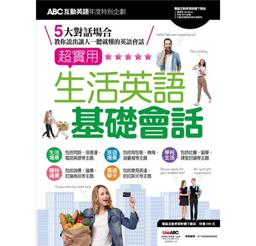 學英語最快的途徑是什麼?答案是從日常生活中遇到的各種情境中學習,最能讓人自然而然地學會英文用語!本年度特別企劃《超實用 生活英語基礎會話》即以此為出發點,以實用對話來帶領讀者,讓讀者不僅能看懂、聽懂英文,更能說出一口漂亮的英文。